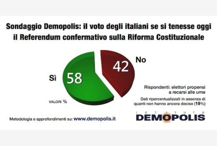Solo il 48% per il sì al referendum di ottobre sulle riforme costituzionali, arriva un sondaggio Euromedia Research - pubblicato da Affaritaliani.it - che vede il no al ddl Boschi in vantaggio al 52%.
